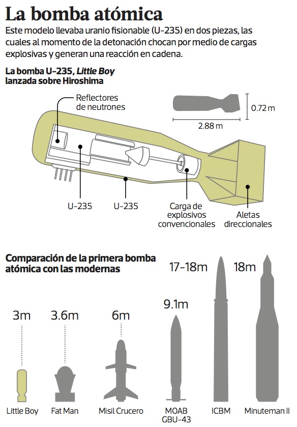 El 6 de agosto de 1945 la aeronave Enola Gay sobrevuela la ciudad japonesa de Hiroshima y a las 8.15 hora local, deja caer la bomba de unos 4 mil kilos y 16 kilotones de potencia denominada Little Boy la cual explotó a 500 metros del suelo.