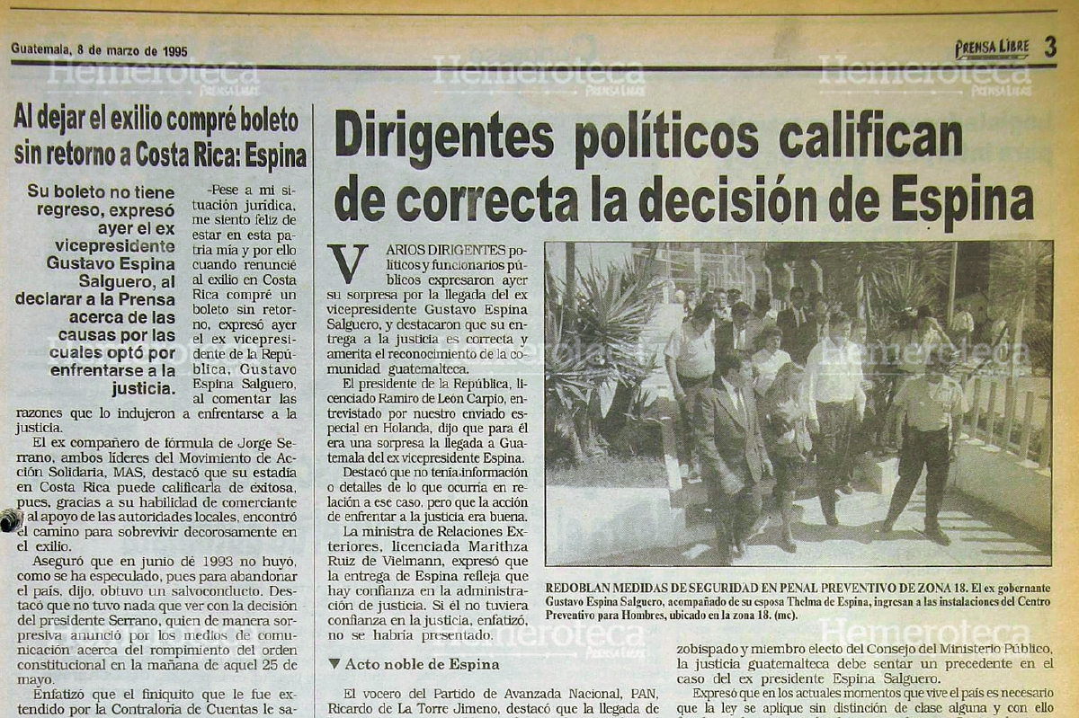 El presidente de la República, licenciado Ramiro de León Carpio, entrevistado en Holanda, dijo que para él era una sorpresa la llegada a Guatemala del ex vicepresidente Espina. La ministra de Relaciones Exteriores, Marithza Ruiz de Vielmann, expresó que la entrega de Espina refleja que hay confianza en la administración de justicia. Si él no tuviera confianza en la justicia, enfatizó, no se habría presentado.