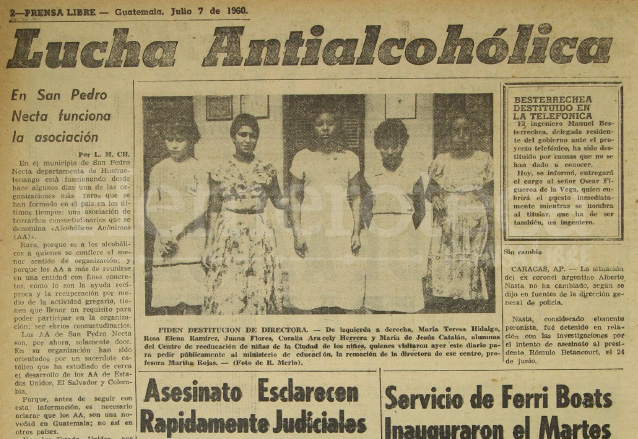 En una publicación de julio de 1960 —ese año es cuando se empieza a contar el inicio de la organización en el país— se daba así la noticia del surgimiento de este grupo: “Está funcionando desde hace algún tiempo, una de las organizaciones más raras que se ha formado en el país en los últimos tiempos: una asociación de borrachos consuetudinarios que se denomina Alcohólicos Anónimos (AA)”, cita el libro Historia de Alcohólicos Anónimos en Guatemala.