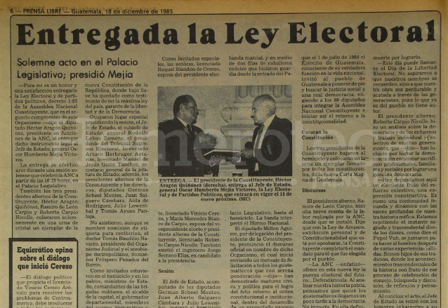 El 3 de diciembre de 1985 la Asamblea Nacional Constituyente aprobó la Ley Electoral llevando el decreto número 1-85 y en un acto solemne en el Congreso fue entregada al jefe de Estado Mejía Víctores. La norma reguló las elecciones de ese año en la cual fue electo el presidente Vinicio Cerezo Arévalo, primer civil en casi treinta años de regímenes militares.
