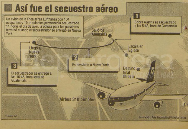 El 11 de febrero de 1993 trascendía el secuestro de un avión Airbus 300 de la empresa alemana Lufthansa con 104 personas a bordo el cual fue desviado a Nueva York, Estados Unidos.