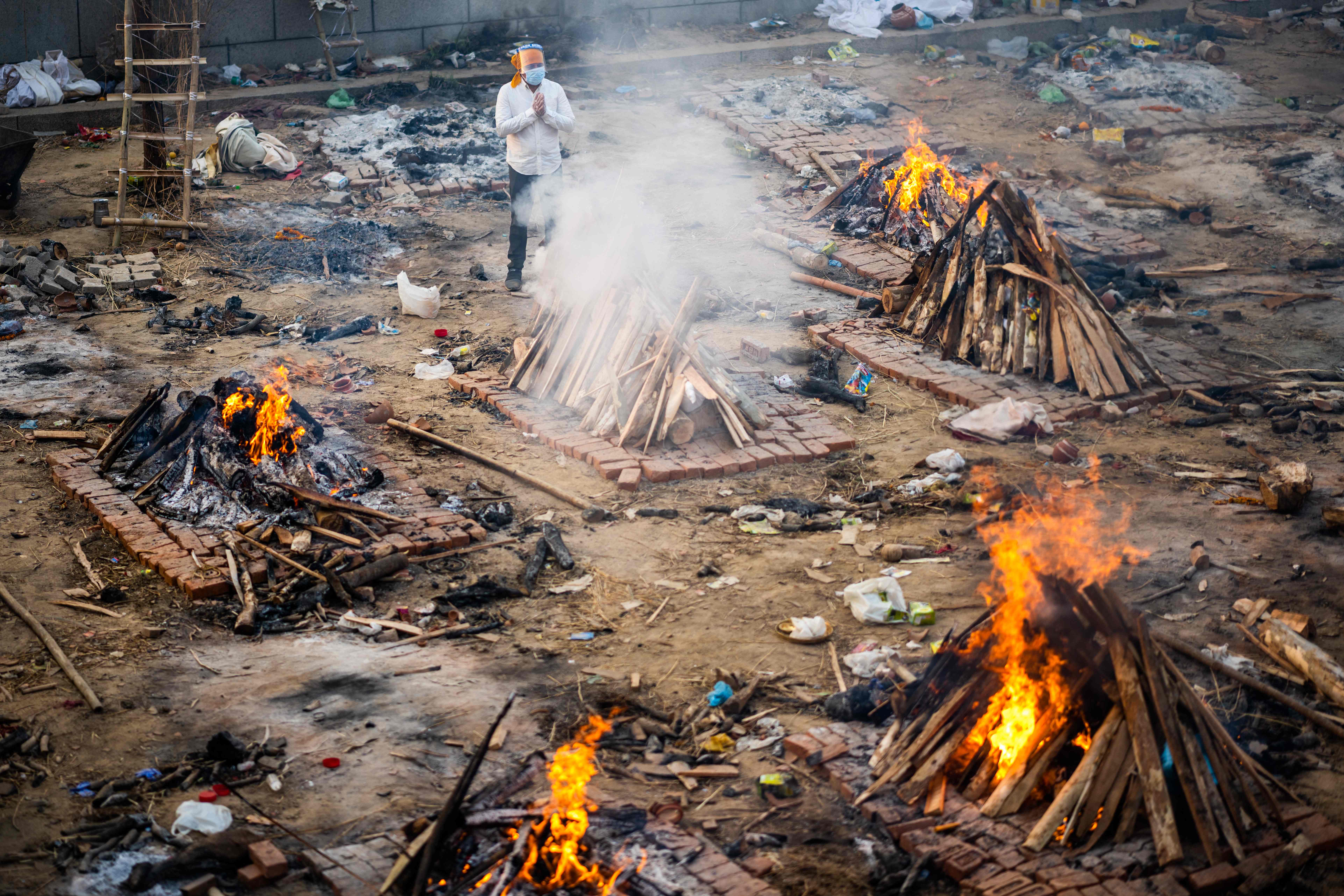 Los afganos se suben a un avión mientras esperan en el aeropuerto de Kabul el 16 de agosto de 2021, después de un final asombrosamente rápido de la guerra de 20 años de Afganistán, mientras miles de personas asaltaban el aeropuerto de la ciudad tratando de huir de los talibanes. (Foto Prensa Libre: AFP)Un hombre reza junto a una pira en llamas de una víctima que murió por el coronavirus en un crematorio en Nueva Delhi el 26 de abril de 2021. (Foto Prensa Libre: AFP)