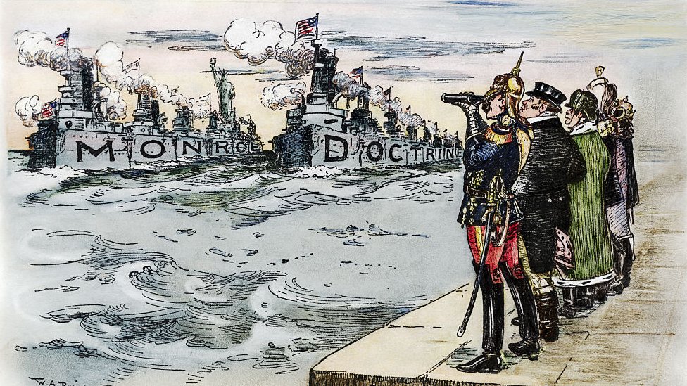 Bajo la Doctrina Monroe, atribuida al expresidente estadounidense James Monroe, que reclamaba una “América para los americanos”, EE.UU. intervino en la disputa sobre la frontera entre la Guayana Británica (actual Guyana) y Venezuela.