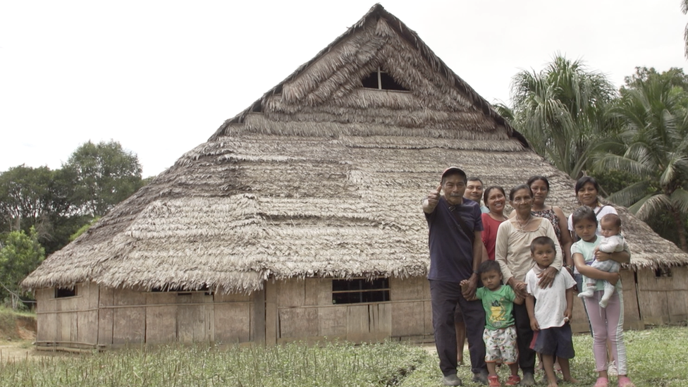 El cacique Calixto Kuiru y su familia en una casa tradicional (maloca) del pueblo Uitito. BBC Mundo