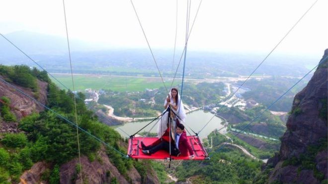 No es un lugar muy común para celebrar un día especial, pero para una pareja en China, colgarse de un puente de cristal sobre un precipicio fue la forma perfecta para festejar su boda. Estuvieron colgados a unos 180 metros de altura tras dar el simbólico: “Sí, quiero”.