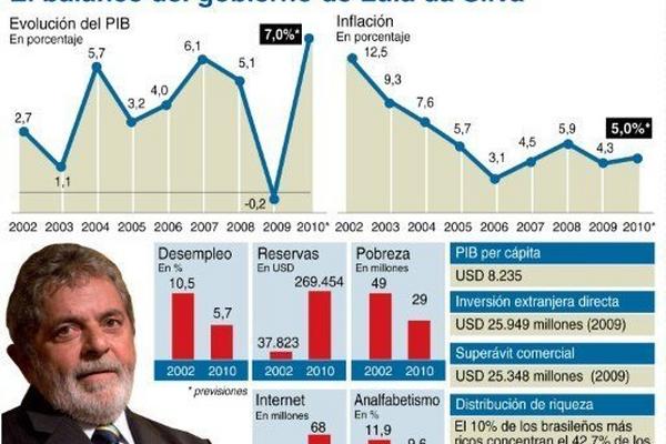 Con una histórica popularidad de 87%, Lula concluyó el viernes en una reunión familiar de fin de año dos intensísimas semanas de viajes, despedidas y balances de un gobierno que termina con crecimiento económico de más de 7%, el menor desempleo histórico, de 5,7%, y 29 millones de brasileños que dejaron de ser pobres.