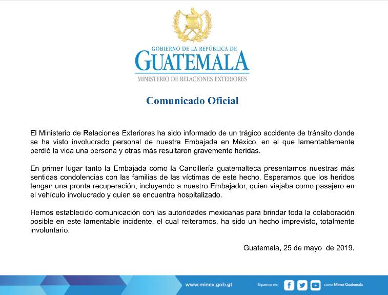 “La Embajada como la Cancillería guatemalteca presentamos nuestras más sentidas condolencias con la familias de las víctimas en este hecho. Esperamos que los heridos tengan una pronta recuperación, incluyendo a nuestro embajador, quien viajaba como pasajero en el vehículo involucrado y quien se encuentra hospitalizado”, refiere el comunicado