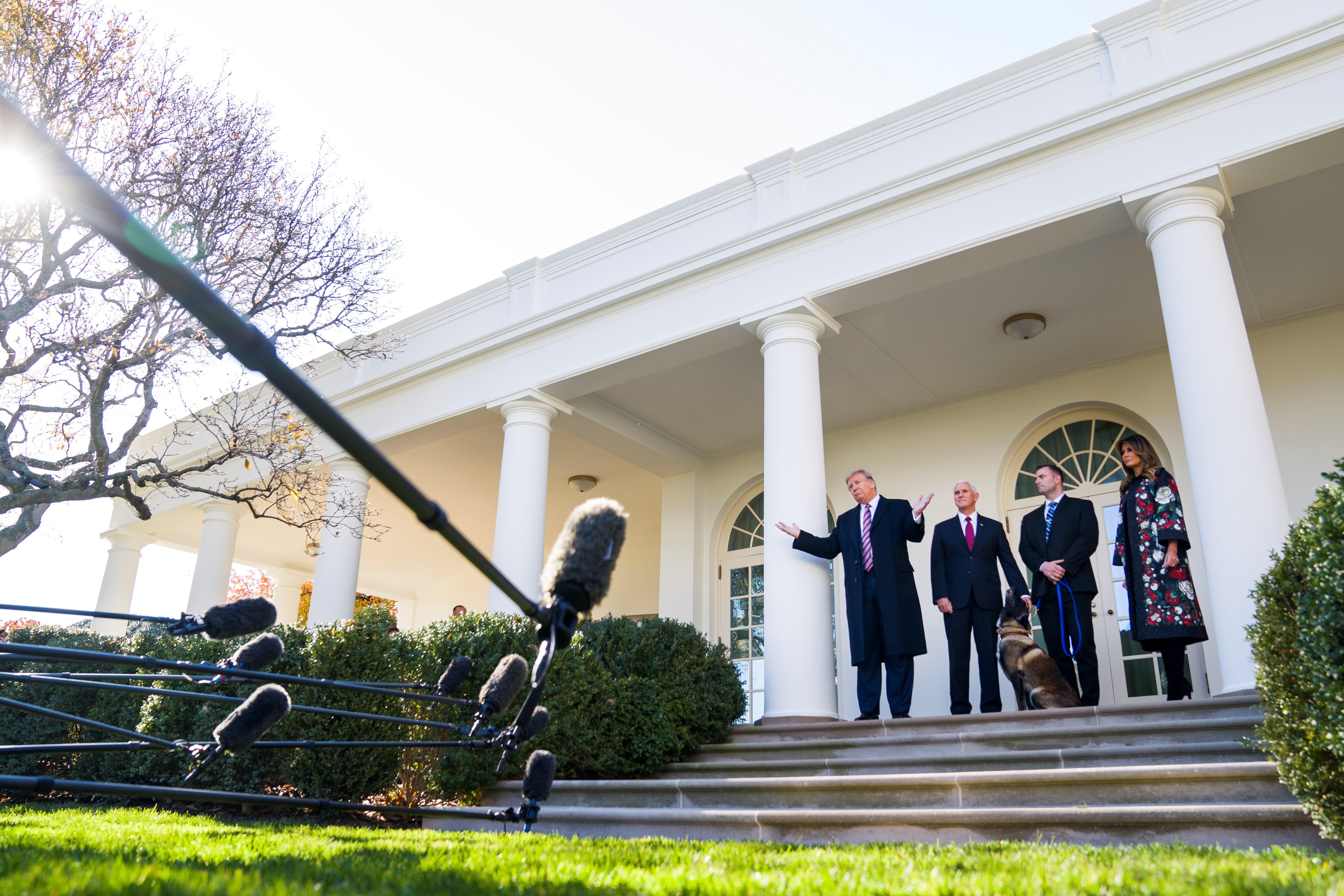 “La perra es increíble. Tan brillante y tan lista”, afirmó Trump, quien estuvo acompañado por el vicepresidente Mike Pence y su esposa, la primera dama Melania.