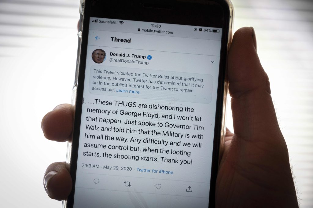 “Cuando comience el saqueo, comienza el tiroteo. Gracias”, escribió Trump.