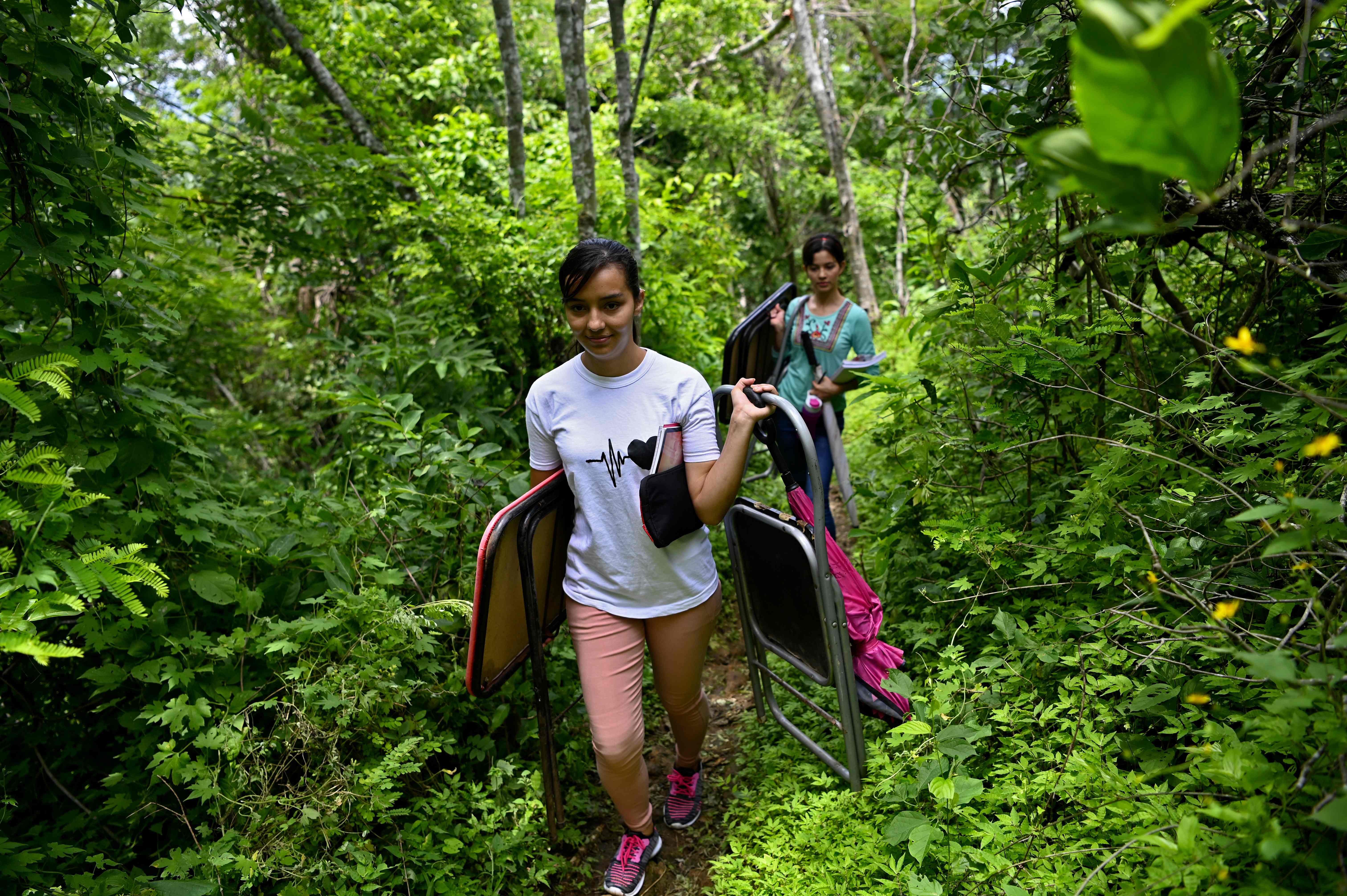Las hermanas Matilde y Marlene Pimentel Álvarez llevan cuesta arriba sus estudios universitarios: a diario deben subir una montaña en el oeste de El Salvador y luego encaramarse a un árbol para obtener la señal que les permita seguir sus clases virtuales.