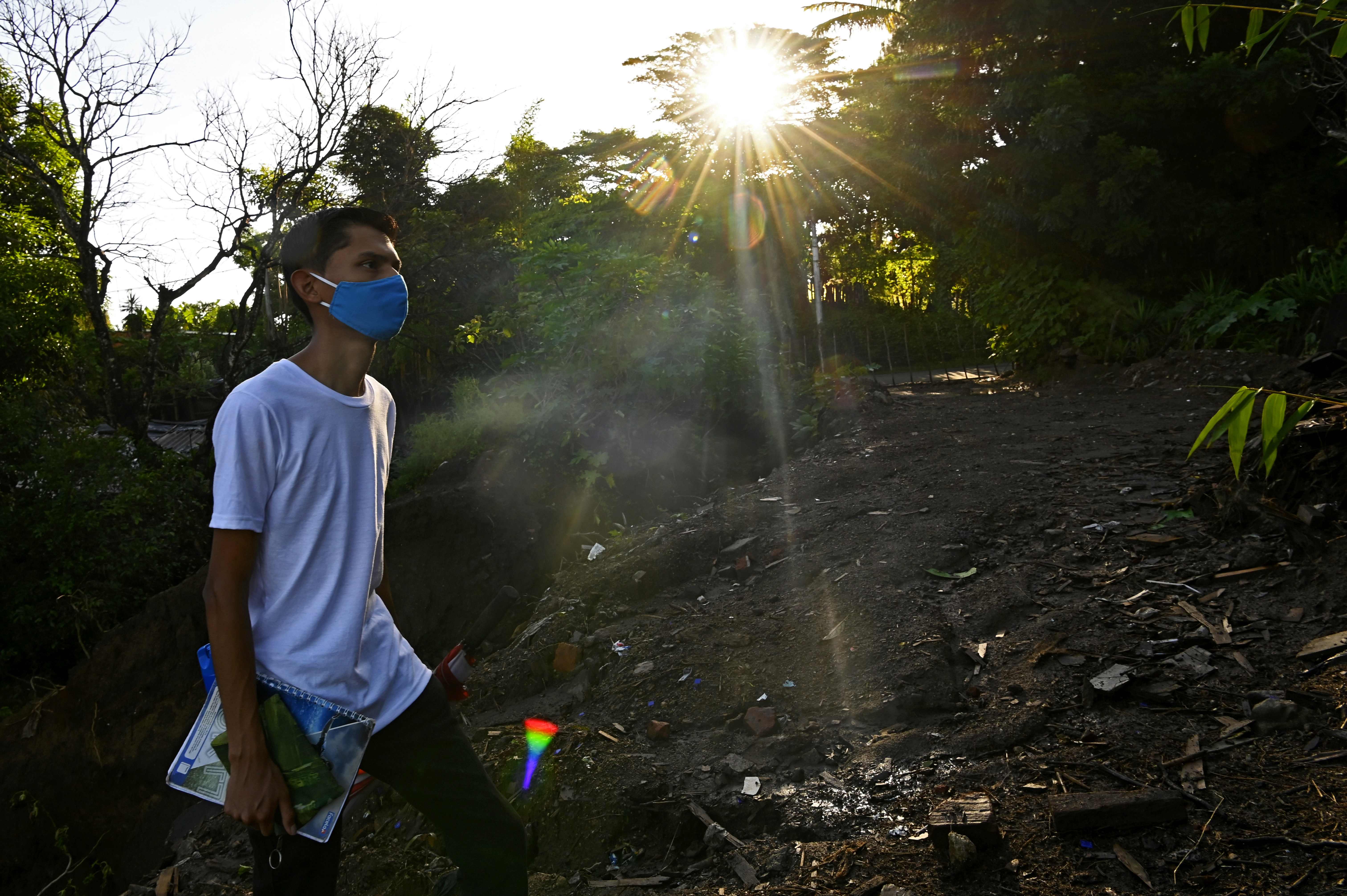Érick Palacios, un becario universitario que vive unos 20 km al oeste de San Salvador, también camina largas distancias en busca de internet. (Foto Prensa Libre: AFP)