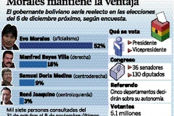 Las encuestas dan a Morales y a su vicepresidente Álvaro García Linera, del oficialista Movimiento Al Socialismo (MAS), la victoria en las elecciones generales, con 52 por ciento de las preferencias de los votantes.