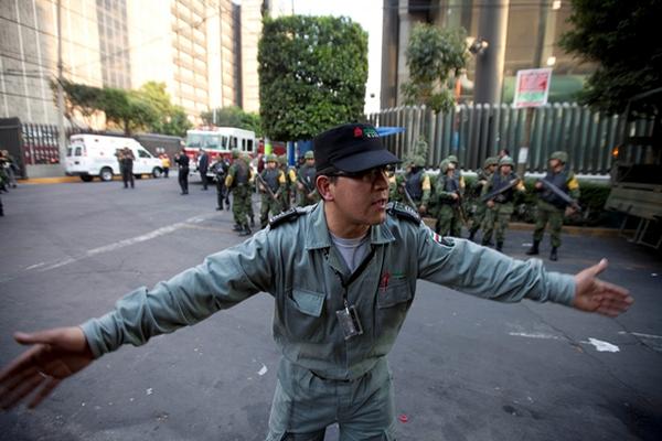 Un guardia de seguridad trabaja con otros agentes en mantener acordonado el sector donde ocurrió la explosión en un edificio de Pemex. (Foto Prensa Libre: AP)
