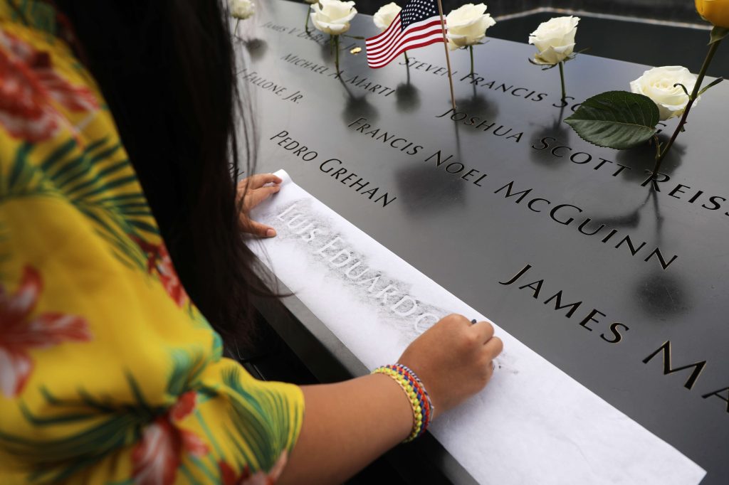 Cientos de flores fueron dejadas en el National Memorial en el 18 aniversario de los ataques del 11 de septiembre. Foto Prensa Libre/ Drew Angerer/AFPKate Sylvain y su hijo Francis, de 5 años, visitan el Memorial Nacional del 11 de septiembre en la conmemoración de los ataques del 11 de septiembre de 2019 en la ciudad de Nueva York. foto Prensa Libre/ Drew Angerer/AFPLa sobrina de Luis Eduardo Torres, quien fue asesinado mientras trabajaba como corredor en Cantor Fitzgerald, copia su nombre en el Memorial Nacional del 11 de septiembre, durante la ceremonia de conmemoración matutina para las víctimas de los ataques terroristas dieciocho años después. foto Prensa Libre/ Spencer Platt/AFP