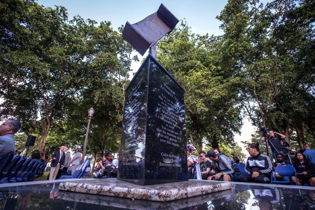 Detalle de una corbata con la imagen de las torres gemelas durante la ceremonia conmemorativa del 18 aniversario de los atentados del 11 de septiembre este miércoles, en el Campus Norte del Miami. Foto Prensa libre/ EFE/ Giorgio Viera