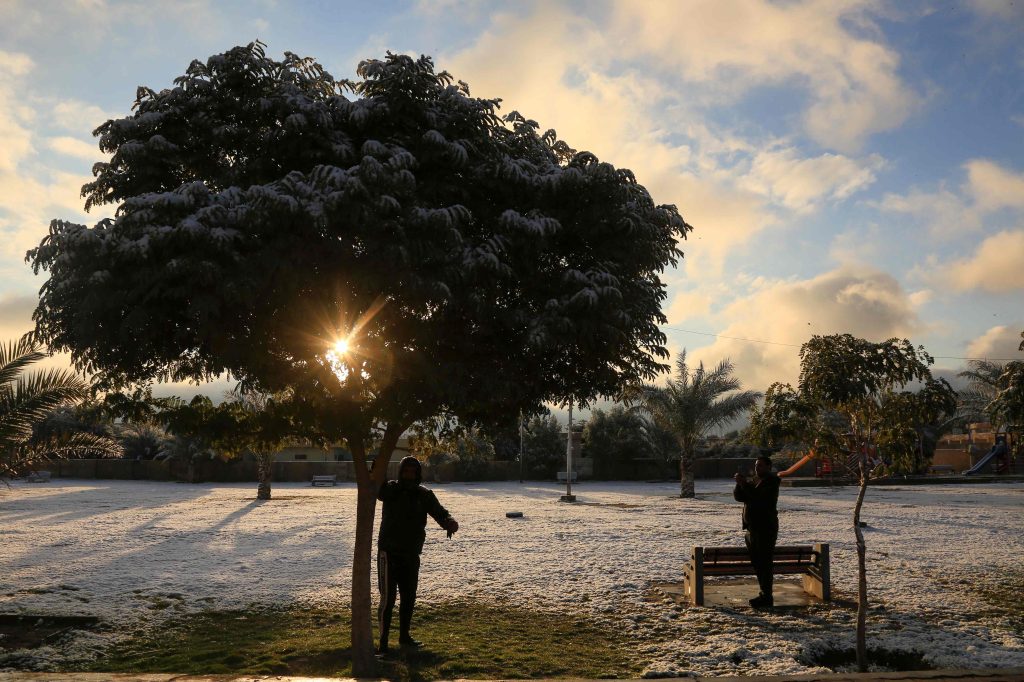 En el residencial Karrada en Bagdad se ve cubierto de nieve, un fenómeno extremadamente raro para uno de los países más calurosos del mundo. Fotografía Prensa Libre: AFP