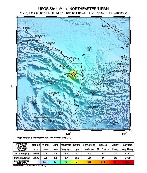 El epicentro se situó cerca de la localidad de Sepidsang, a unos 80 km de Mashdad, y a una profundidad de 10 kilómetros. El terremoto se produjo a las 10.39 locales.