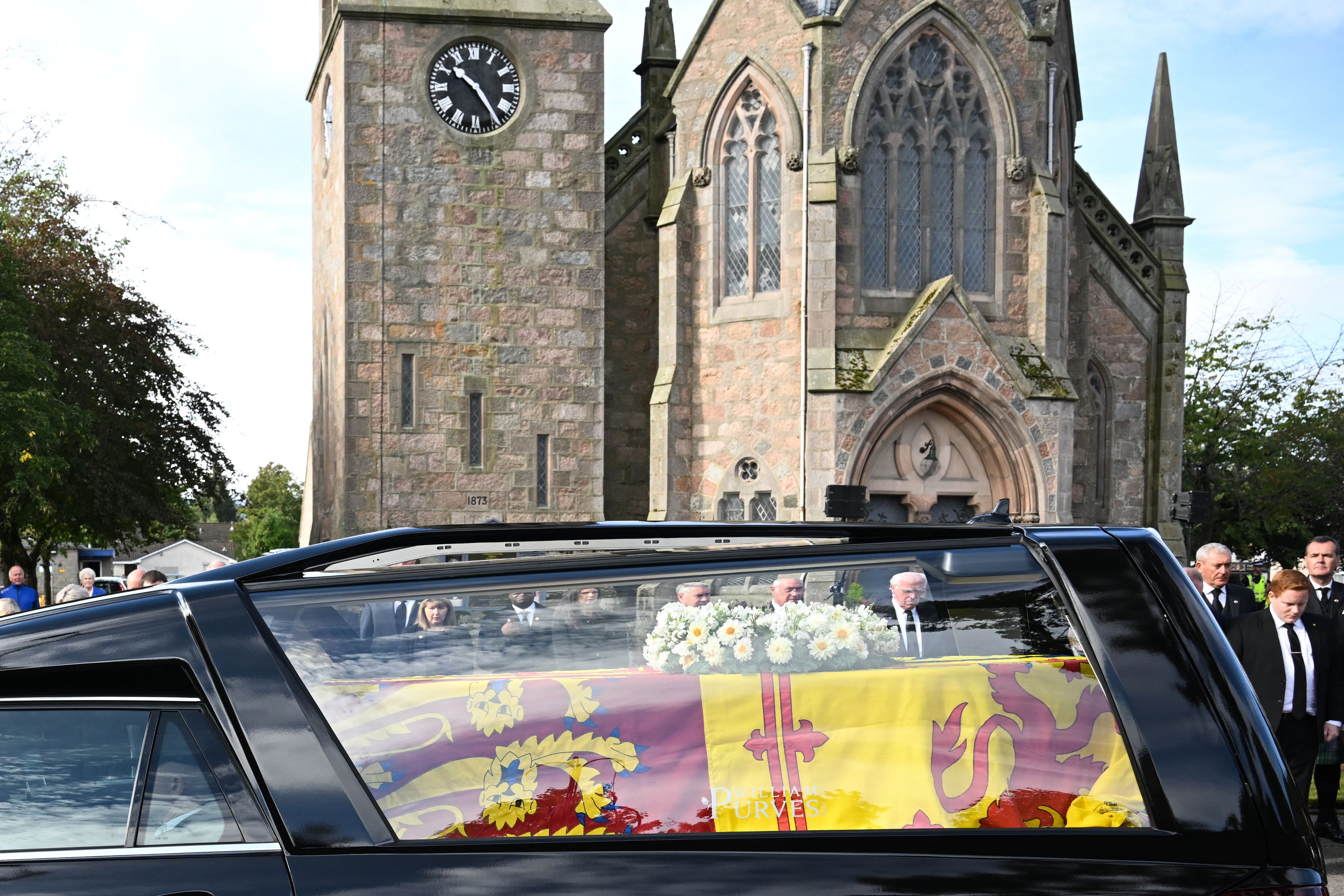 Miles de personas contemplaban el paso del cortejo fúnebre a través de la verde campiña escocesa. En Ballater, la primera localidad atravesada y donde la reina era muy conocida, la gente estaba apostada en la calle principal y algunos lanzaron flores.