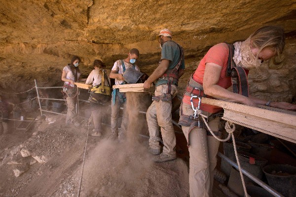 Para proteger las antigüedades, los arqueólogos y voluntarios descienden a más de 80 metros de profundidad mediante cuerdas, y luego se arrastran por las cavidades, sacando cubos de tierra y rocas.