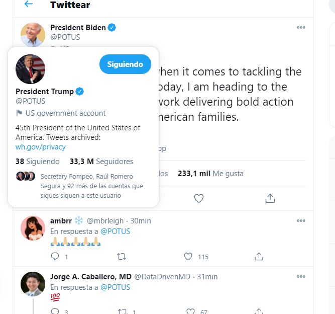 Cuando Biden publicó su primer tuit en @POTUS y se colocaba el cursor sobre su nombre, todavía se desplegaba una ventana que mostraba una fotografía de Donald Trump y el nombre del exmandatario.