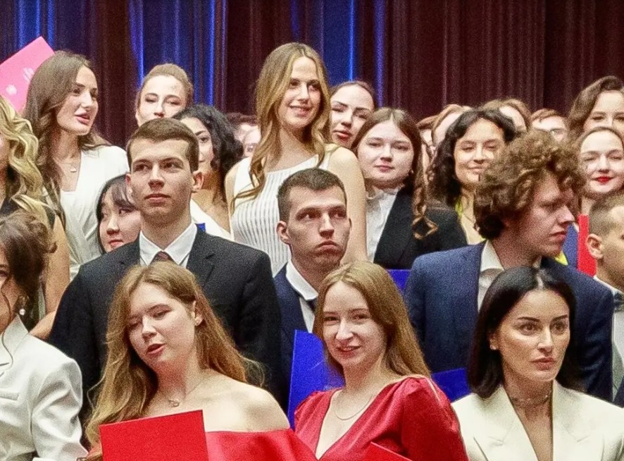 Zein al Asad, en el centro, con vestido blanco a rayas, en su graduación en el Instituto Estatal de Relaciones Internacionales de Moscú, el 30 de junio. El Times encontró la foto en una carpeta de Google Drive de acceso público alojada en la universidad.Credit...Instituto Estatal de Relaciones Internacionales de Moscú