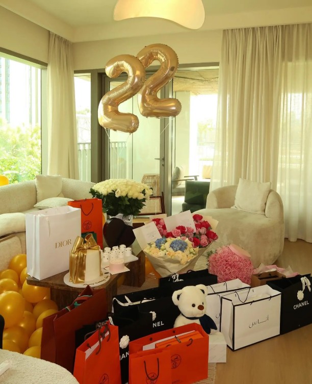 Una publicación del cumpleaños de Sham al Asad mostraba globos dorados con forma de 22 rodeados de regalos en bolsas de marcas de lujo como Hermès, Chanel y Dior.