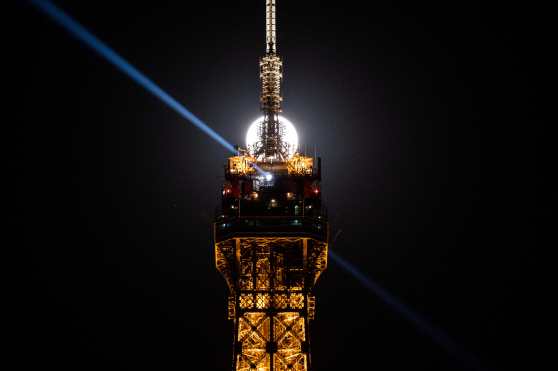 La luna llena se eleva sobre la Torre Eiffel en París, Francia. (Foto Prensa Libre: AFP)