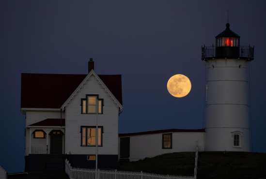La Superluna rosa se observa detrás del Faro Nubble en Cabo Neddick, en York, Maine, Estados Unidos. (Foto Prensa Libre: EFE)