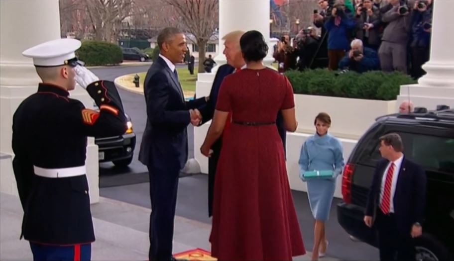 Al llegar el vehículo que transportaba al presidente Trump, este desciende e inmediatamente se dirige hacia Barack Obama y su esposa sin esperar a su esposa Melania, que incluso es ayudada por Obama a subir la pequeña escalinata.