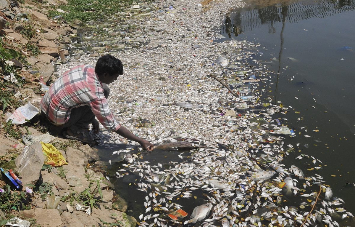 Al lago llegan aguas residuales de muchas zonas de la ciudad, dijo Purshottam, lo que disminuye los niveles de oxígeno en el agua.