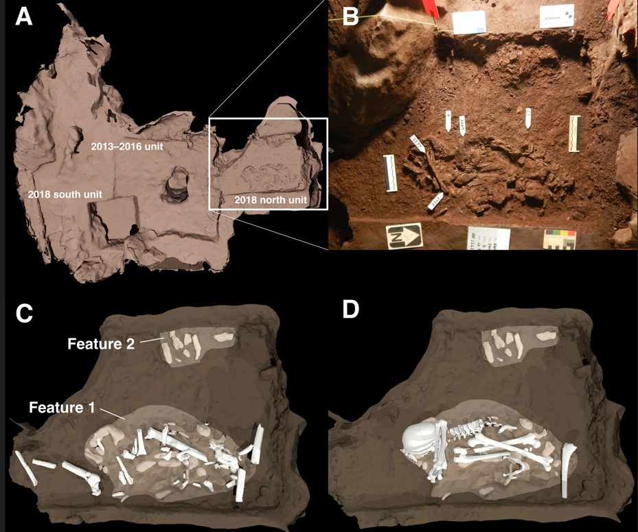 Al principio, los científicos pensaron que los fósiles estaban diseminados de manera uniforme por el suelo de la cámara, pero al excavar más sedimentos en 2018, observaron que dos esqueletos bastante completos descansaban dentro de depresiones ovaladas.