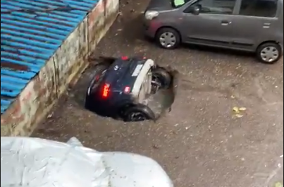 Una fotografía de una camioneta que cayó en el socavón fue compartida por varios medios y usuarios en redes sociales. Además, se informó que la camioneta es de uso oficial.