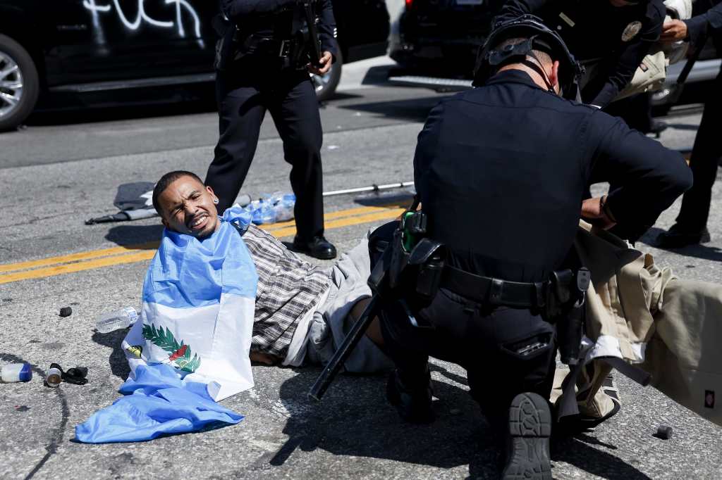 Policías arrestan a un manifestante guatemalteco durante una serie de protestas en Los Ángeles, California. (Foto Prensa Libre: AFP)