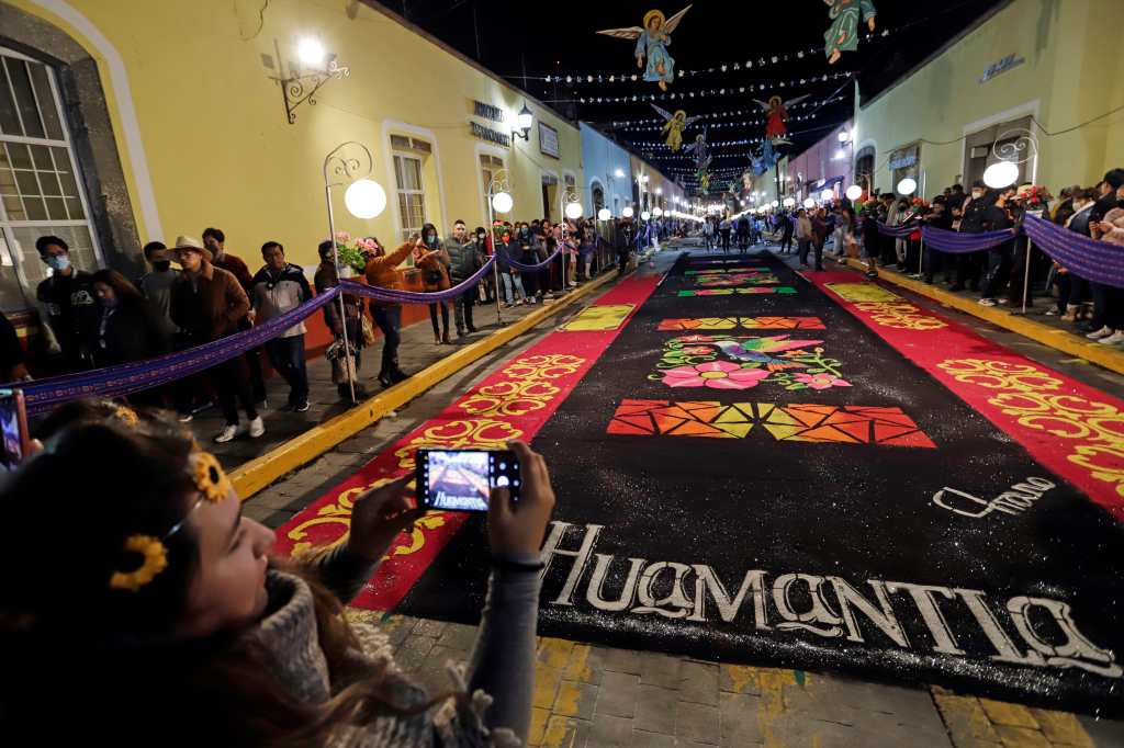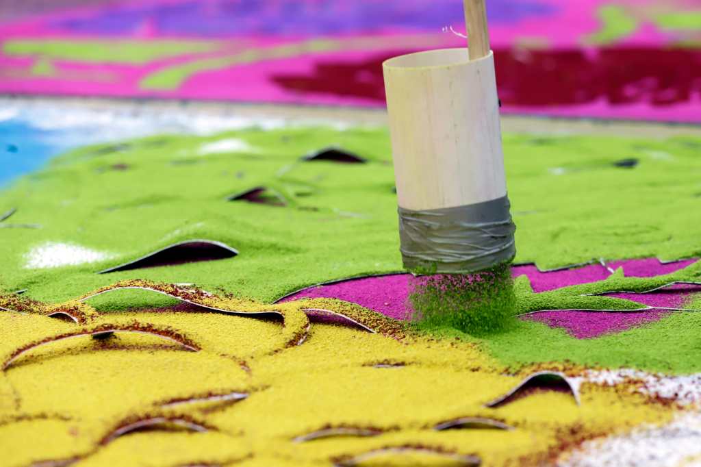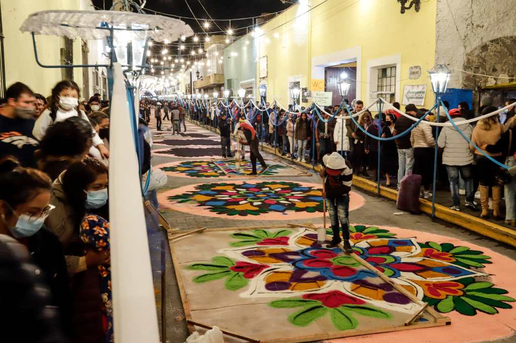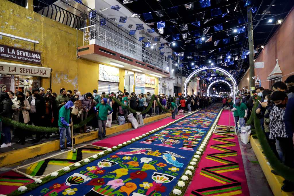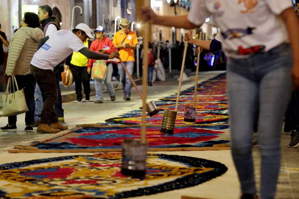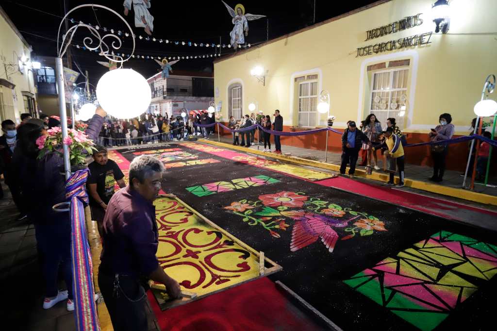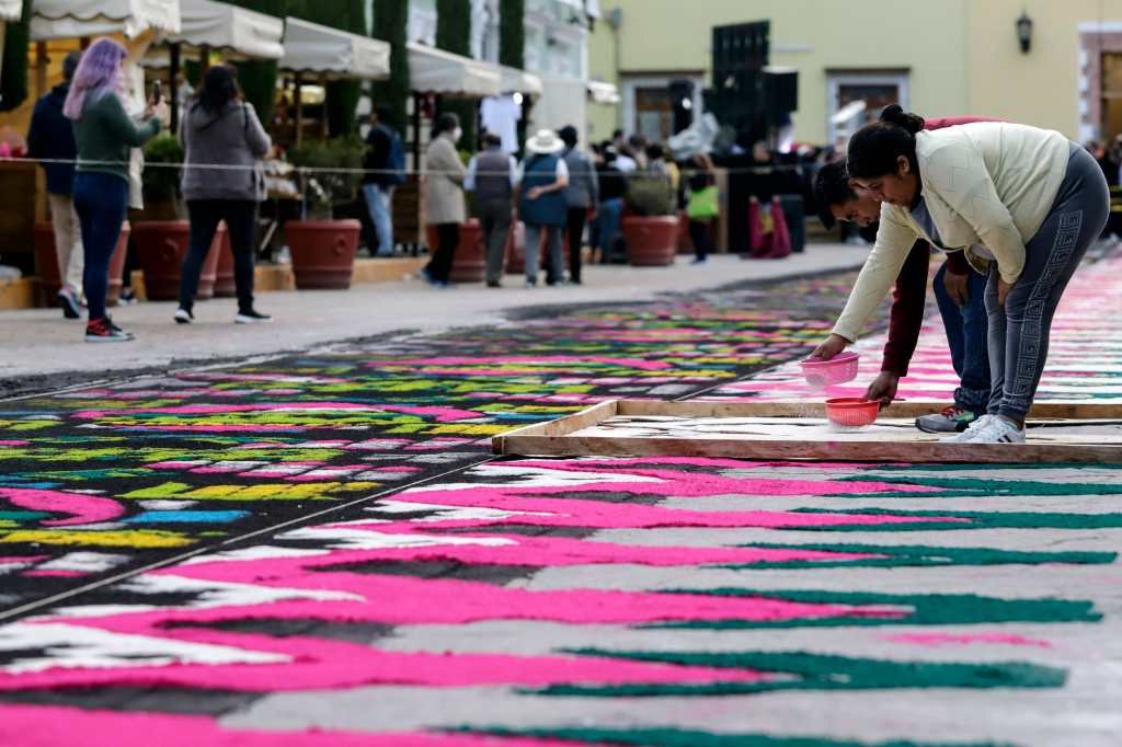 El artesano Jaime Servín Altamirano compartió con Efe que desde los 7 años apoyaba a su padre a colocar tapetes en la ciudad, donde aprendió a combinar colores, diseñar imágenes para plasmarlas en moldes elaborados con cartón y entonces colocarlas en un arco de madera.