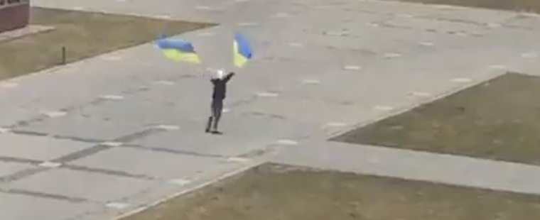 En las imágenes, el soldado parece retroceder y los civiles despliegan entonces tres banderas ucranianas y las agitan.