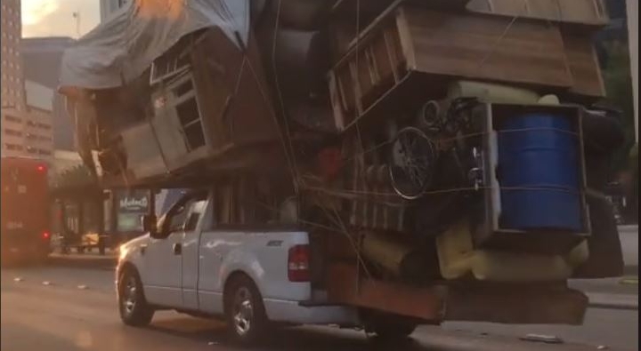 Sillones, gavetas, mesas, armarios, cilindros de gas, colchones, espejos y demás muebles son algunos de los objetos que lleva el vehículo por el centro de la Ciudad de México, específicamente en el Paseo de la Reforma.