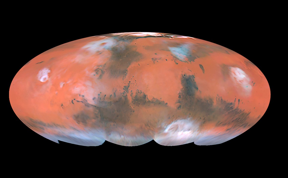 Para avistamientos en luz visible, el telescopio espacial Hubble, en órbita alrededor de la Tierra, puede ver un lado completo de Marte. Los científicos juntaron muchas de esas imágenes para generar un mapa global similar al nuevo mapa de la sonda Hope.