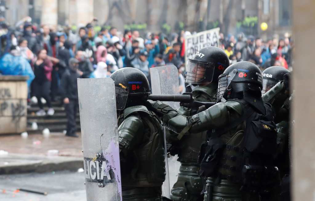 En la capital Bogotá hubo enfrentamiento de policías antidisturbios y estudiantes, que pretendían llegar al aeropuerto internacional, y con encapuchados en la Plaza de Bolívar.