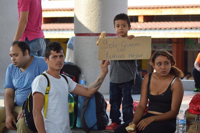 Una familias que acompaña el viacrucis del migrante muestra un rótulo que pide un futuro mejor. (Foto Prensa Libre: EFE)