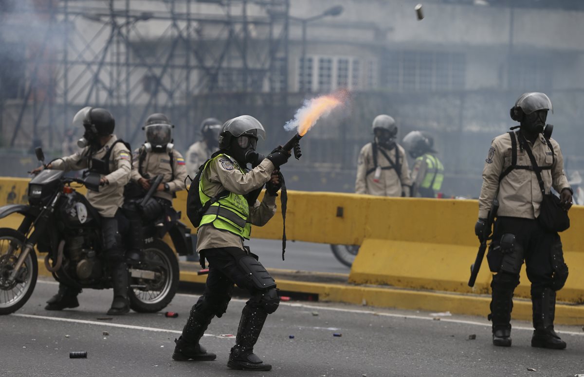 A police officer fires tear gas against anti-government protesters in Caracas, Venezuela, Thursday, April 20, 2017. Venezuela's opposition looks to keep up pressure on President Nicolas Maduro, taking to the streets again one day after three people were killed and hundreds arrested in the biggest anti-government demonstrations in years. (AP Photo/Fernando Llano)