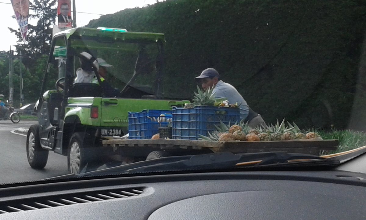 Un agente de la PMT remolca la carreta de frutas de una persona que a diario gana su sustento al vender en las calles.