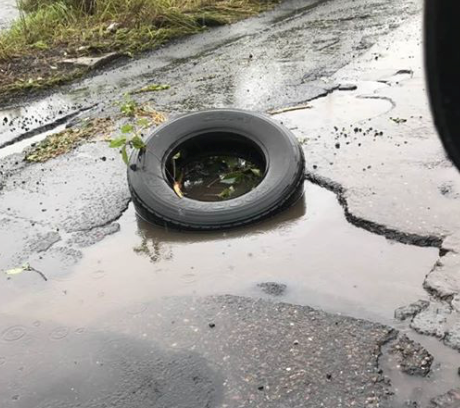 Un lector nos envía esta imagen captada en la ruta de Siquinalá hacia Escuintla. La advertencia para los conductores sobre el bache en la vía es una llanta. Esto es solo una muestra del mal estado de las rutas del país.