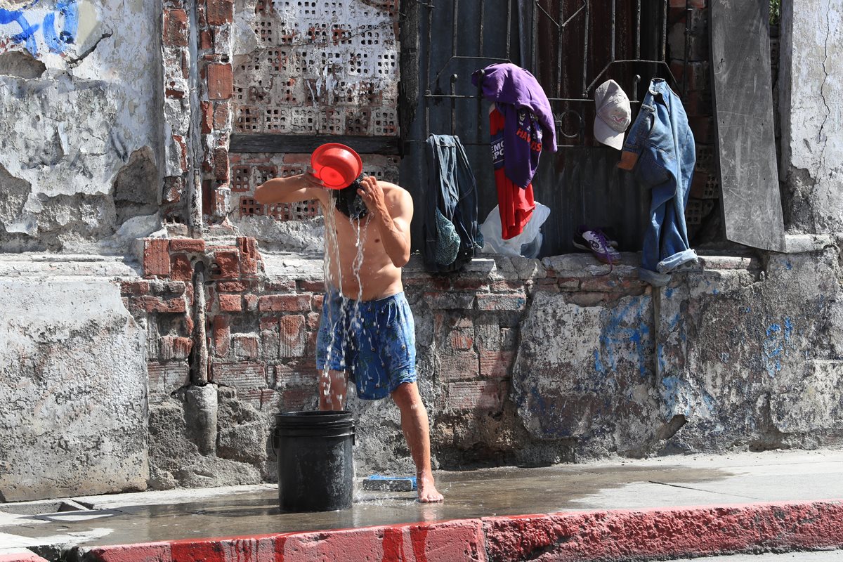 La falta de agua en distintas partes del país obliga a algunos guatemaltecos a buscar opciones para estar limpios. Este joven decidió bañarse en la calle, pero antes lavó bien su ropa.