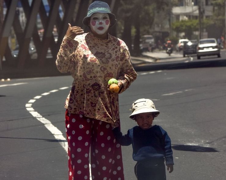 Una mujer realiza actos de malabarismo en la calzada San Juan, acompañada de un pequeño, para poder ganar el sustento diario. Esta imagen refleja la realidad que viven algunos guatemaltecos.