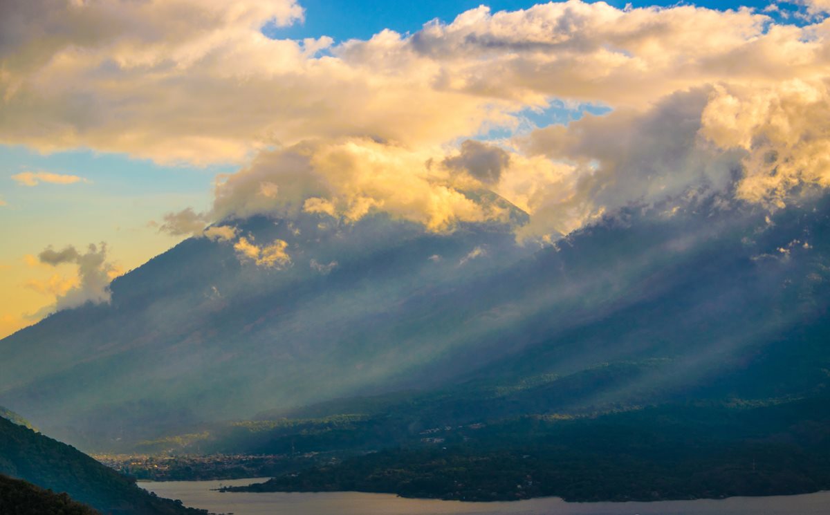 Los últimos  rayos del sol iluminan el Lago de Atitlán, mientras los volcanes de Sololá despiden otro día.