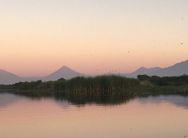 La tonalidad del atardecer se pinta en un paraje de Monterrico. Volcanes, agua, verde y el Sol que dice adiós, todo en una sola escena.