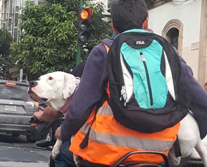 Un joven fue captado cuando viajaba como pasajero en una moto y llevaba un perro en las piernas. Una peligrosa forma de viajar.