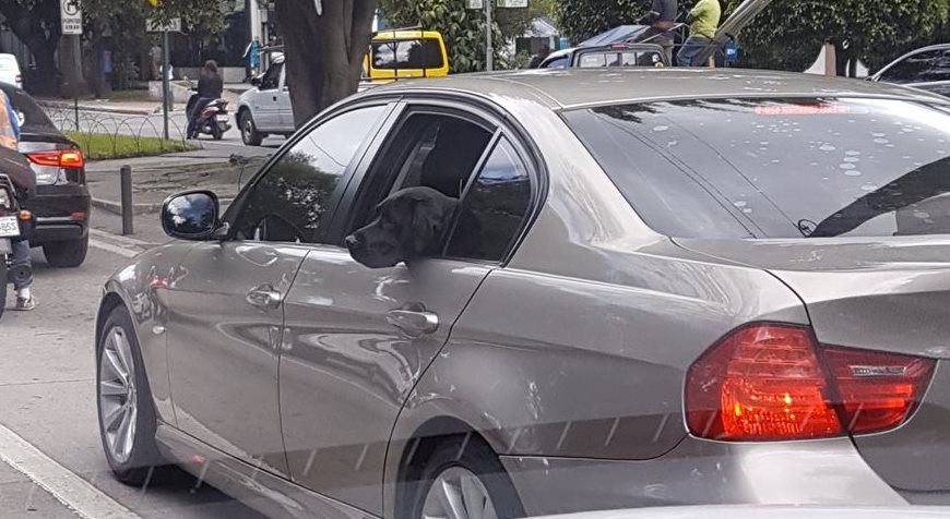 Un can fue captado en la avenida Reforma, zona 10, cuando viajaba en la parte trasera de un vehículo mientras disfrutaba del paseo.