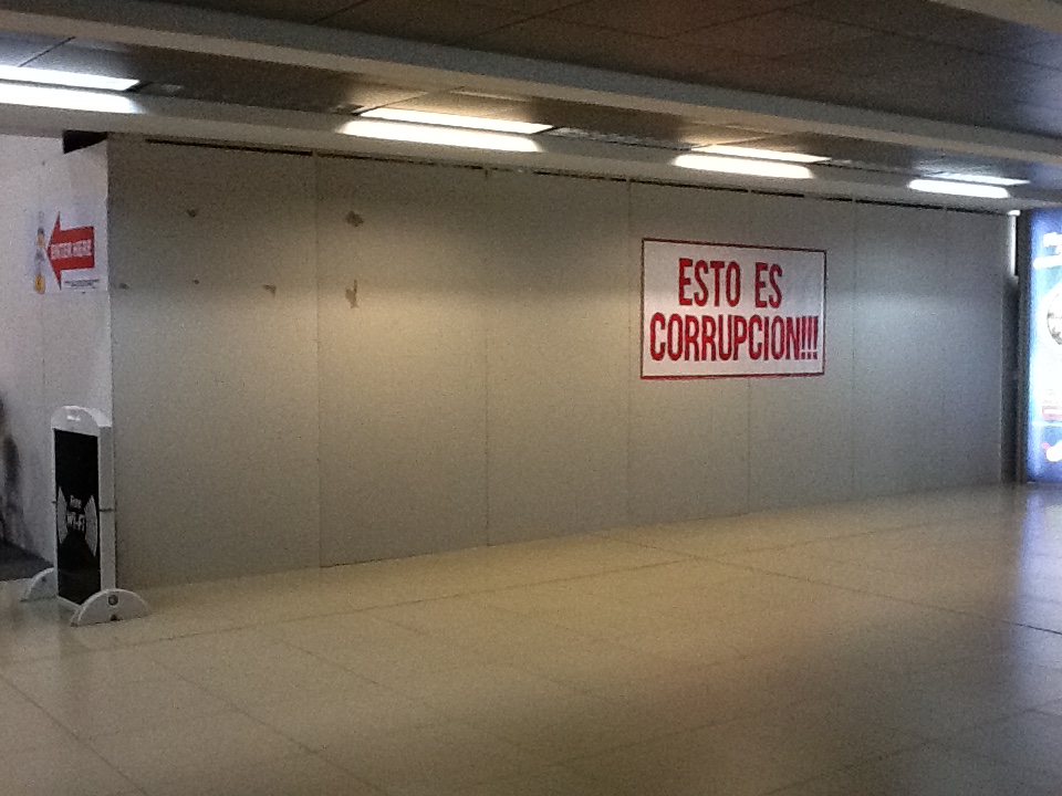 Un cartel que dice “esto es corrupción” es visto en los pasillos del Aeropuero La Aurora.