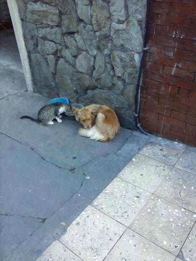 Una curiosa fotografía muestra a un gato y a un perro mientras comparten de la misma agua.